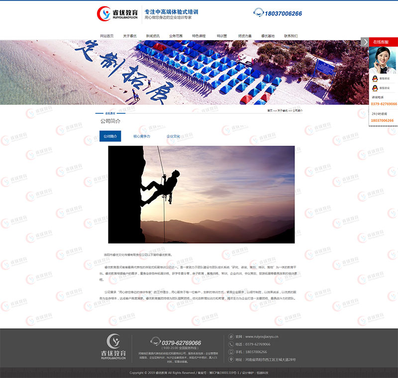 睿優(yōu)教育是河南省具代表性的體驗(yàn)式拓展培訓(xùn)公司之一。是一家致力于團(tuán)隊(duì)建設(shè)與團(tuán)隊(duì)成長(zhǎng)系統(tǒng)“研究、咨詢、策劃、培訓(xùn)、落地”為一體的教育平臺(tái)。睿優(yōu)教育根據(jù)客戶的需求,開(kāi)發(fā)各種拓展訓(xùn)練、研學(xué)冬夏令營(yíng),親子教育,魔鬼訓(xùn)練、軍訓(xùn)、企業(yè)內(nèi)訓(xùn)、會(huì)議策劃、旅游拓展等有效率的培訓(xùn)課程。