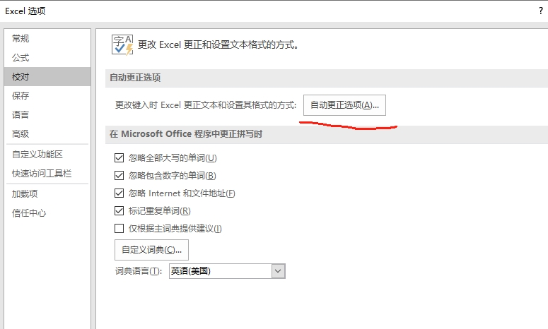 4. 接著,點(diǎn)擊“自動(dòng)更正選項(xiàng)”按鈕,進(jìn)入自動(dòng)更正設(shè)置界面。