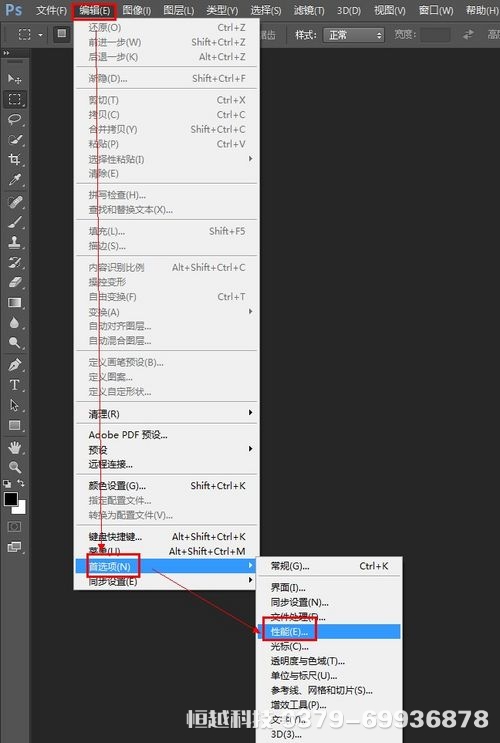 依次點(diǎn)擊“編輯”→→“首選項(xiàng)”→→“性能”→→“暫存盤(pán)”(如下圖所示)。